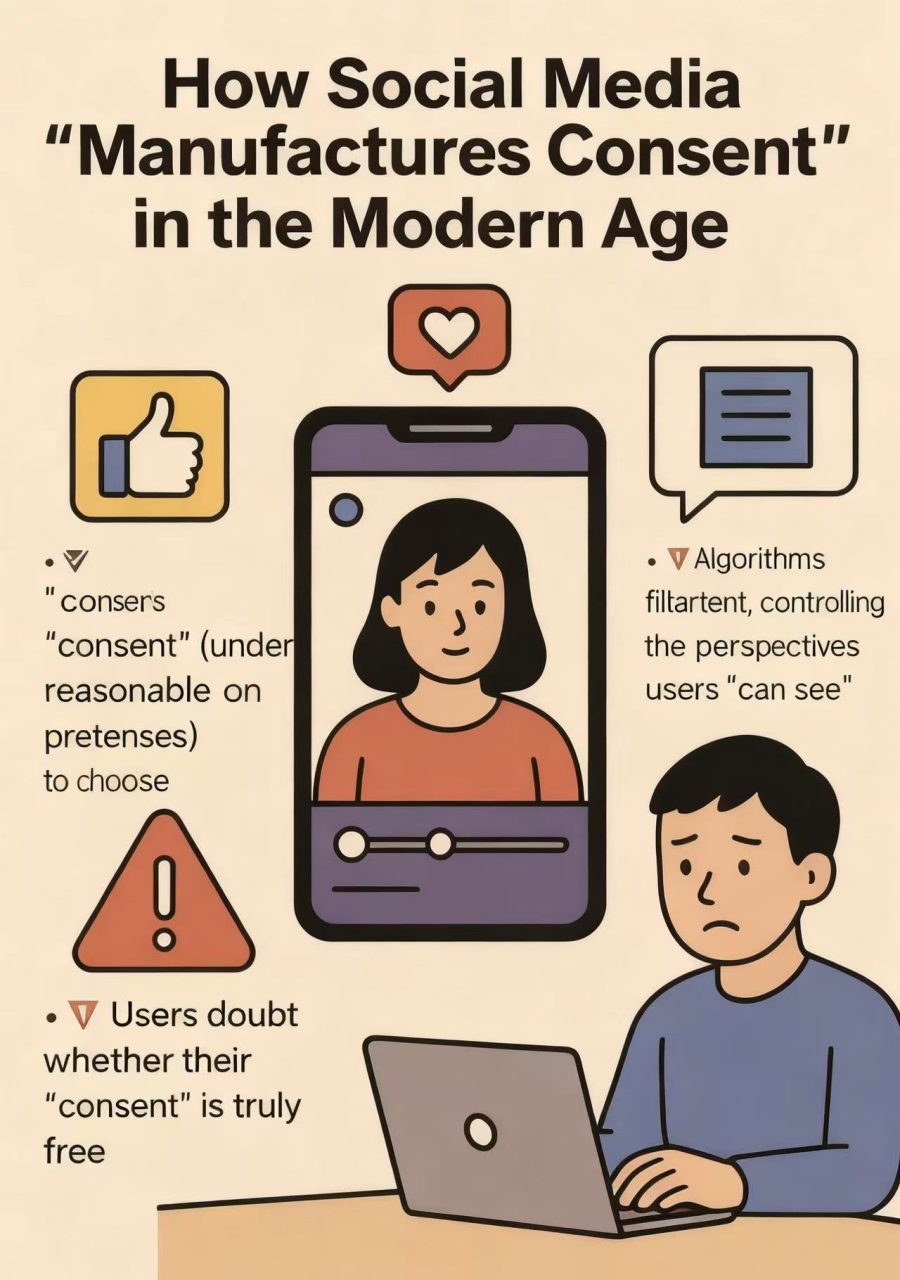 Herman and Chomsky’s idea of Manufacturing Consent was originally about newspapers and TV, but when I think about how I use TikTok or Instagram every day, it feels even more relevant now. I always feel like I’m freely choosing what I watch — but then I realise most of what I “choose” is actually what the algorithm puts in front of me first. In that sense, consent isn’t forced; it’s quietly shaped.