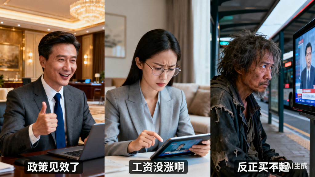 Split screen: Left, the suited businessman grinning and giving a thumbs-up. Middle, the stressed white-collar worker rubbing her temples. Right, the homeless person crossing his arms and rolling his eyes. Same content, three totally different decodes.