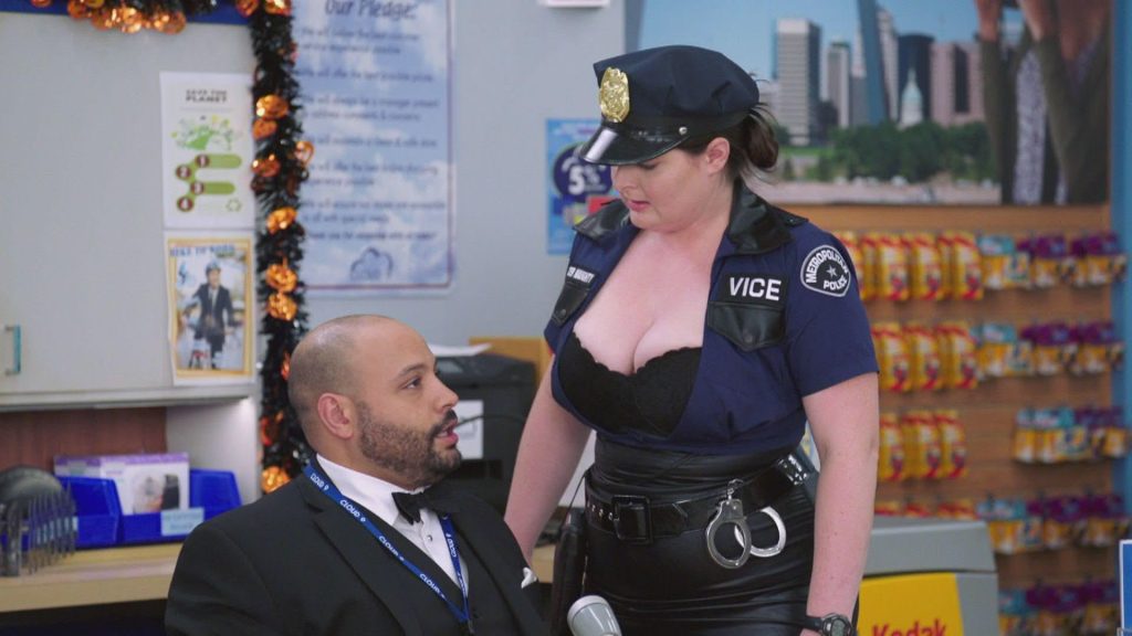 With the theory of the male gaze and how it is primarily focused on the female figure and how women can be sexualised for the heterosexual male pleasure. An example of the use of the male gaze in this way is from one TV show ‘Super Store’. In episode 7 season 2 titled ‘Halloween Theft’, the character of Dina Fox who is the assistant manager of Cloud 9 and is peer pressured by her co-workers into wearing a halloween costume and after being told that she can spend the whole day with the character Sandra who dressed up as Dina for Halloween. Which makes Dina then and go off to find a Halloween costume and she grabs the first one she finds which turns out to be a sexy police officer outfit and for the rest of the episode she has it on and it keeps distracting the other employees from doing their jobs as they all keep looking at her ‘massive breasts’ and specifically one of the employees, Garrett can’t focus on doing the store announcements as he keeps getting distracted by Dina’s boobs and he says ‘my caveman brain says, hey man boobs’ which heavily uses the male gaze but also makes it into a joke in a way how Garrett knows how wired Dina is but his primal or caveman brain is just telling him that hey there are boobs in front of you do something.